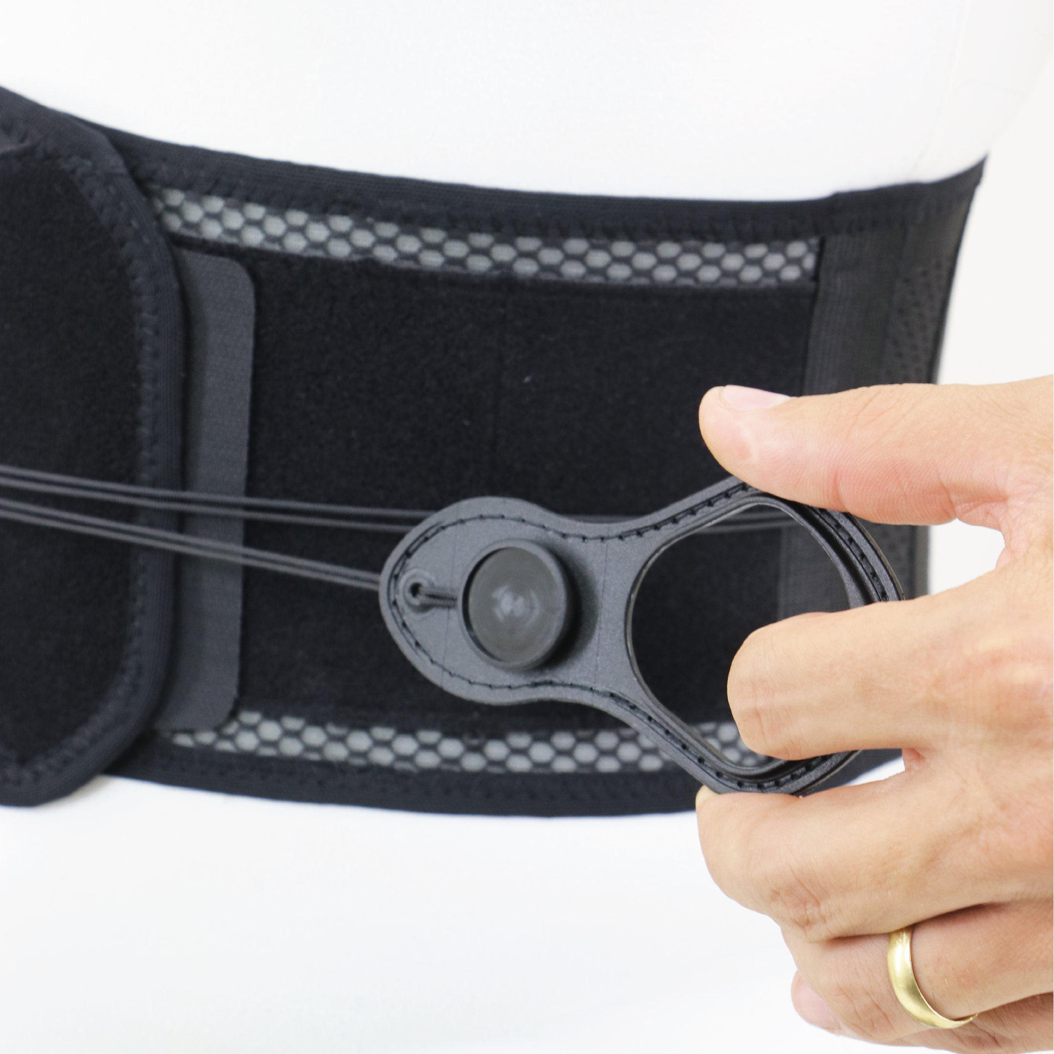 Solte os fechos de contato frontal e os puxadores. Posicione a cinta na região da coluna lombar. Fixe o fecho de contato da região frontal. Encaixe o dedo pela alça do puxador (ambos os lados) tracionando o mesmo para uma compressão secundária, e o fixe através de seu fecho de contato.