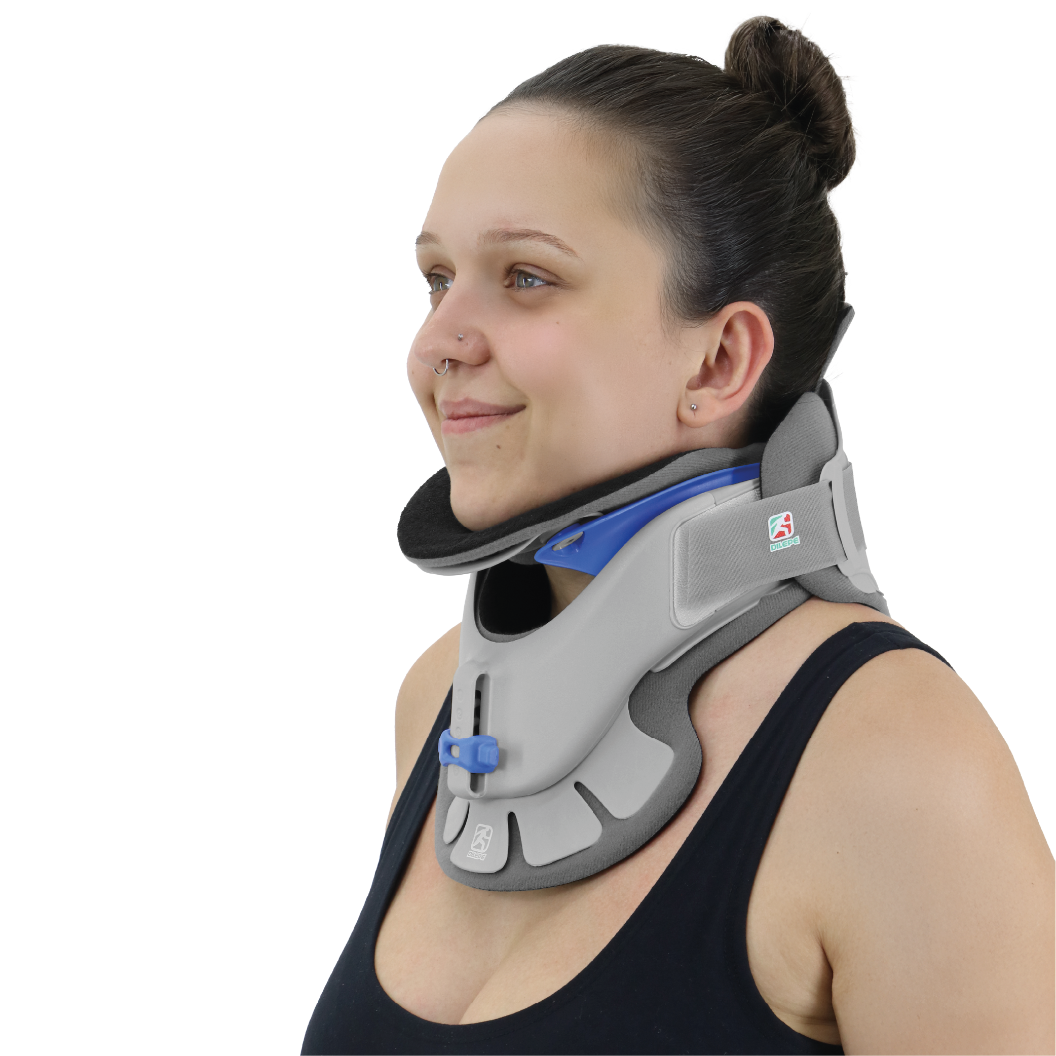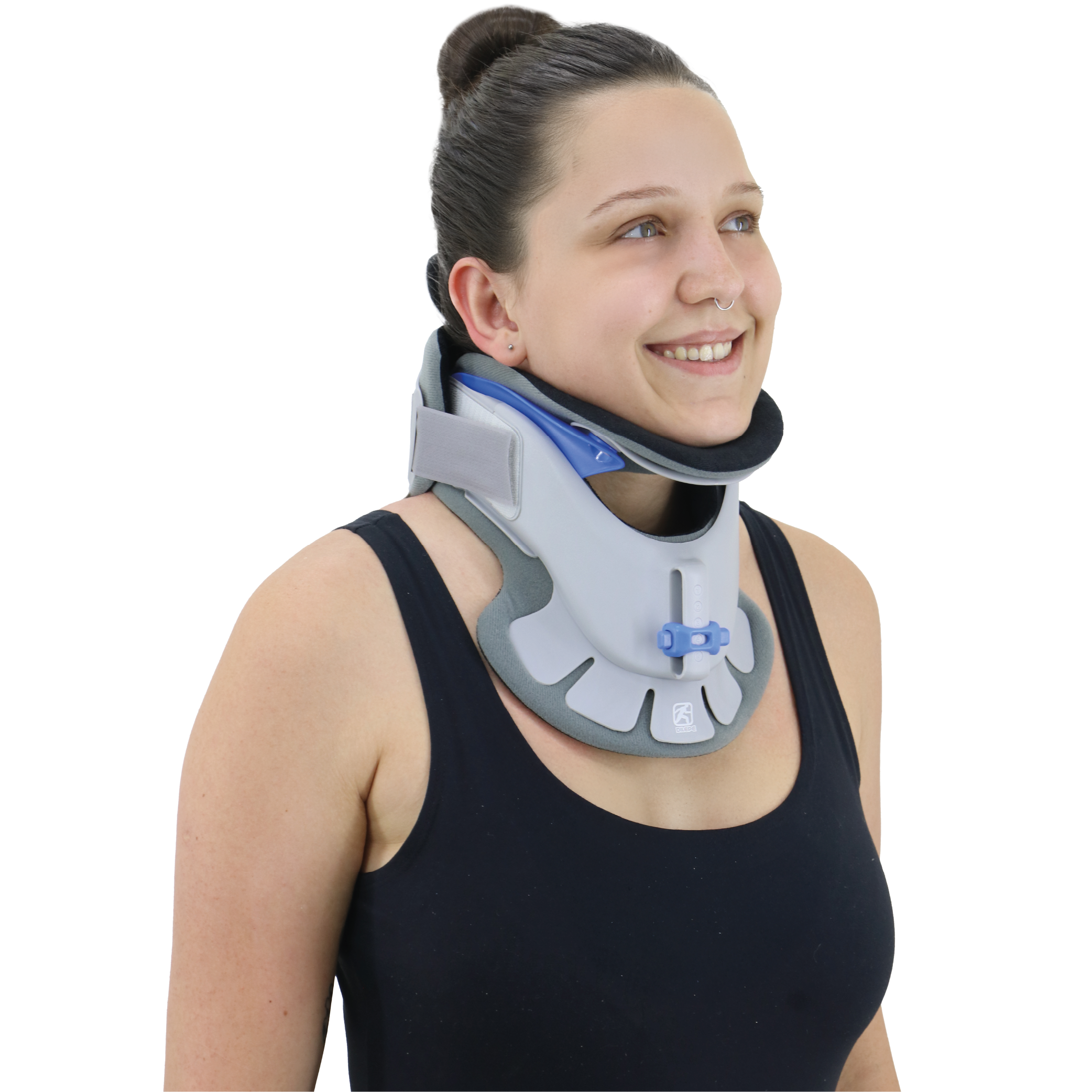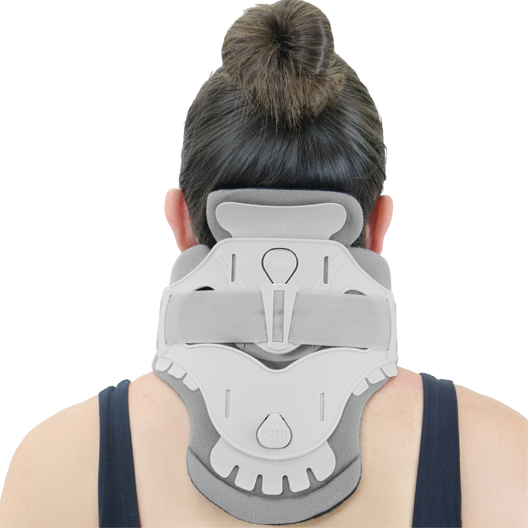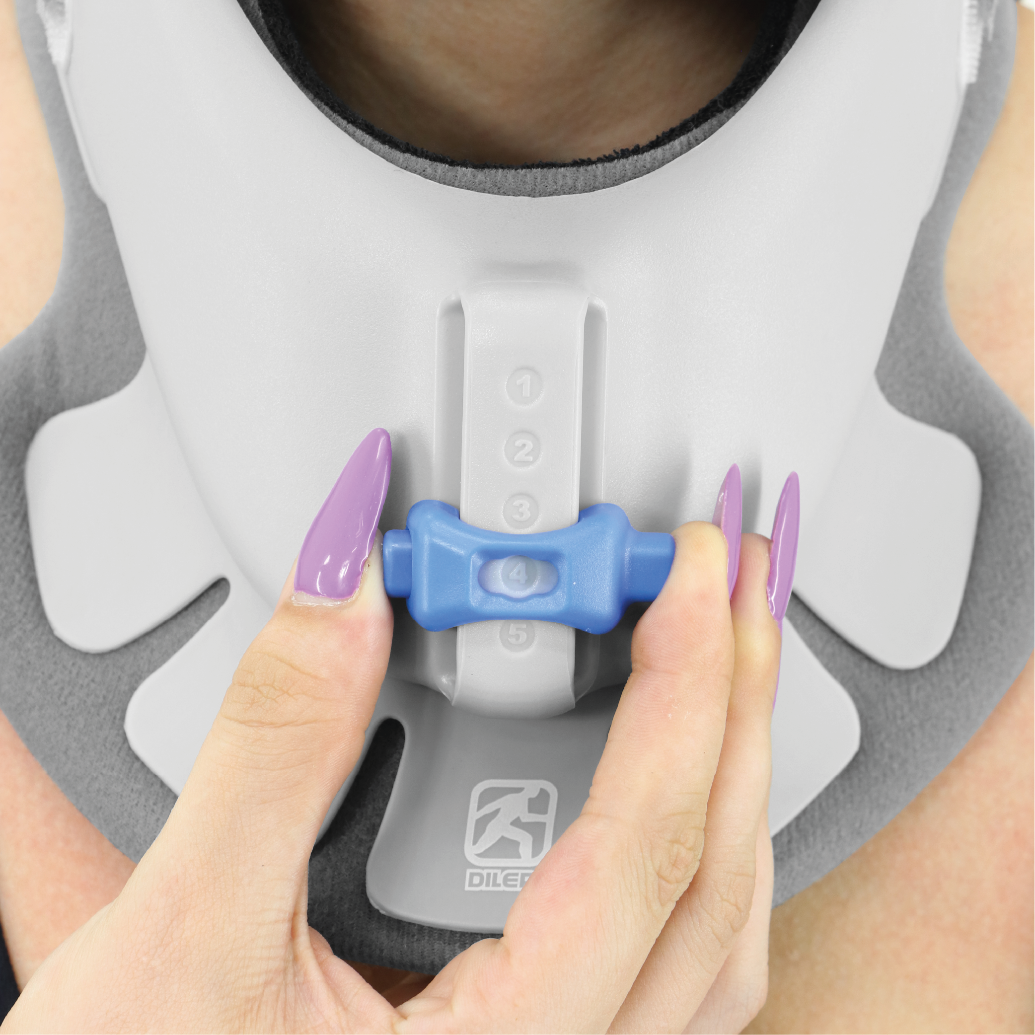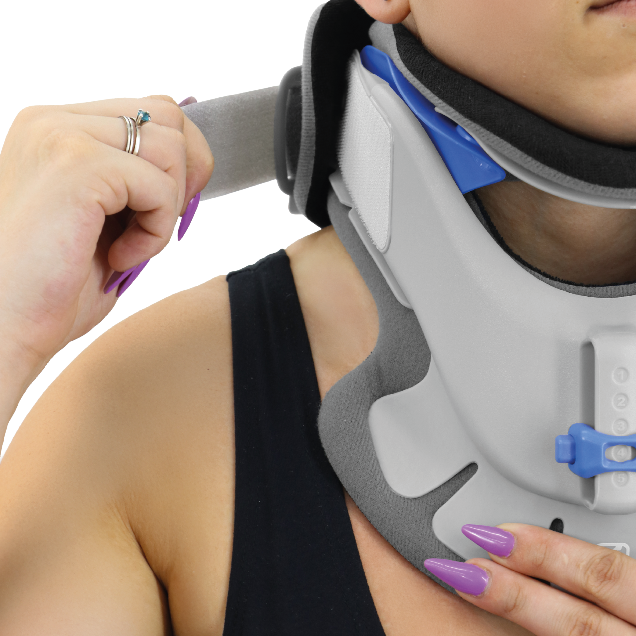 Posicione o colar no pescoço. Uma vez posicionado, coloque suavemente uma mão no painel frontal e prenda com cuidado as alças do painel traseiro aos ganchos laterais para fixação. O produto deve ser usado sob a supervisão de um profissional médico.