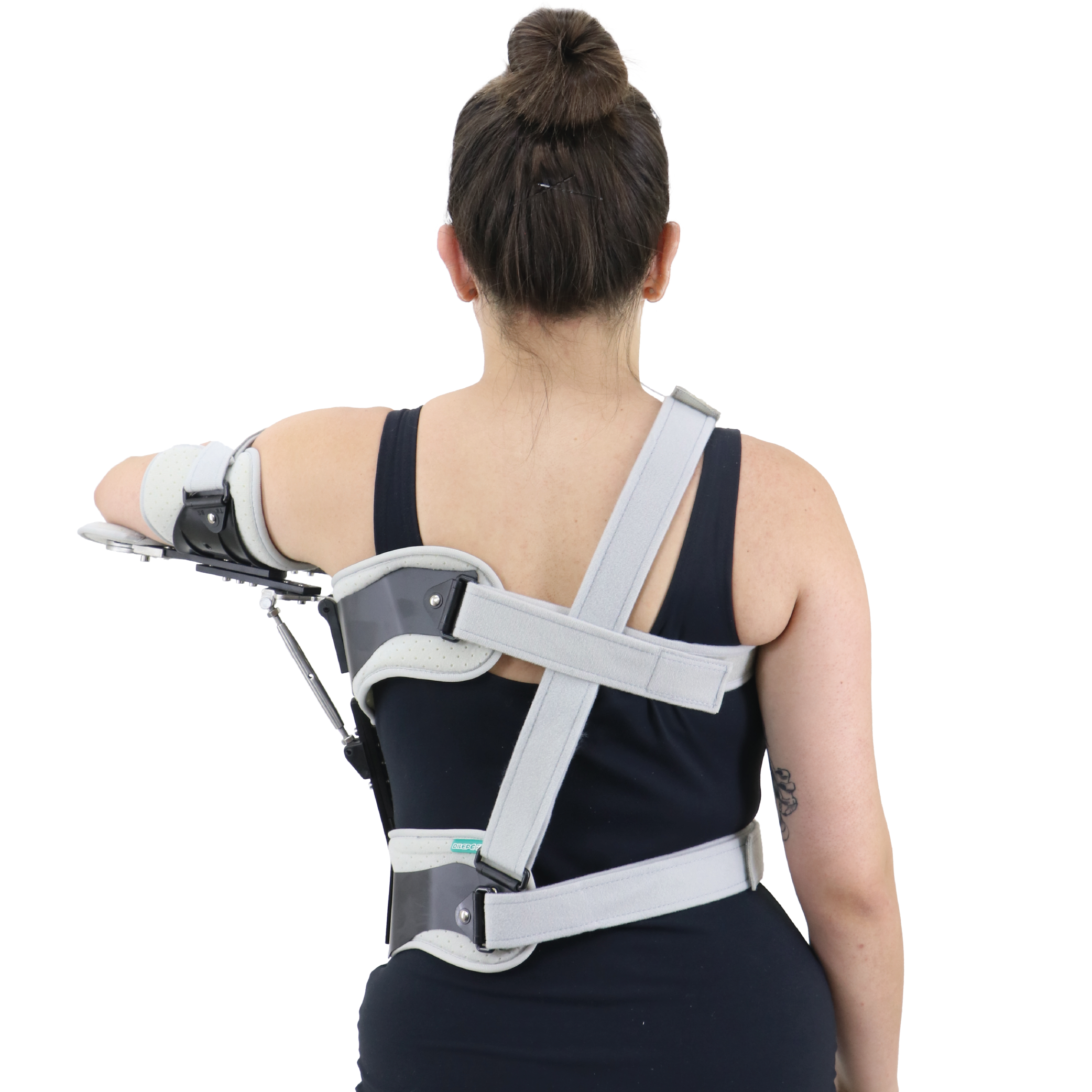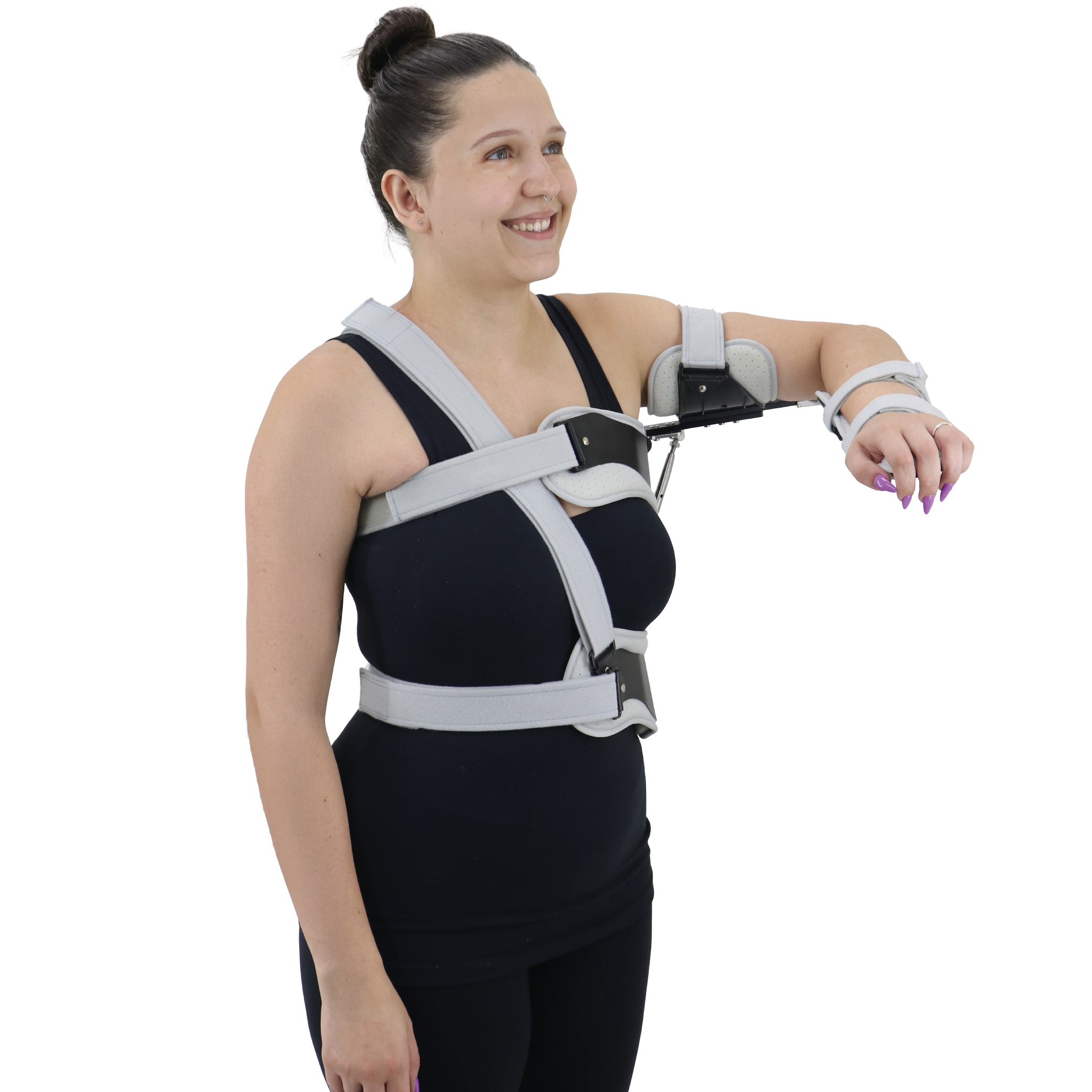 Posicionar o braço e mão (apoio braço/mão), encaixando os apoios laterais na lateral do corpo (tórax e cintura). Transpassar as tiras pelas fivelas plásticas e fixar as mesmas dando o aperto necessário. O mandril giratório possibilita ajuste ideal do cotovelo, ou seja, o lado esquerdo e direito da articulação do cotovelo são ajustáveis, bem como, os ângulos de flexão do cotovelo, flexão e extensão do ombro, e o ângulo de flexão do antebraço.Oferece ainda, o posicionamento correto do ombro em abdução de 10° a 90°, com controle rotacional da rotação interna total e até 70° de rotação externa. Nota: Os ajustes de abdução/adução do ombro são feitos através de contra roscas e parafusos do tipo Allen (produto acompanha chave).