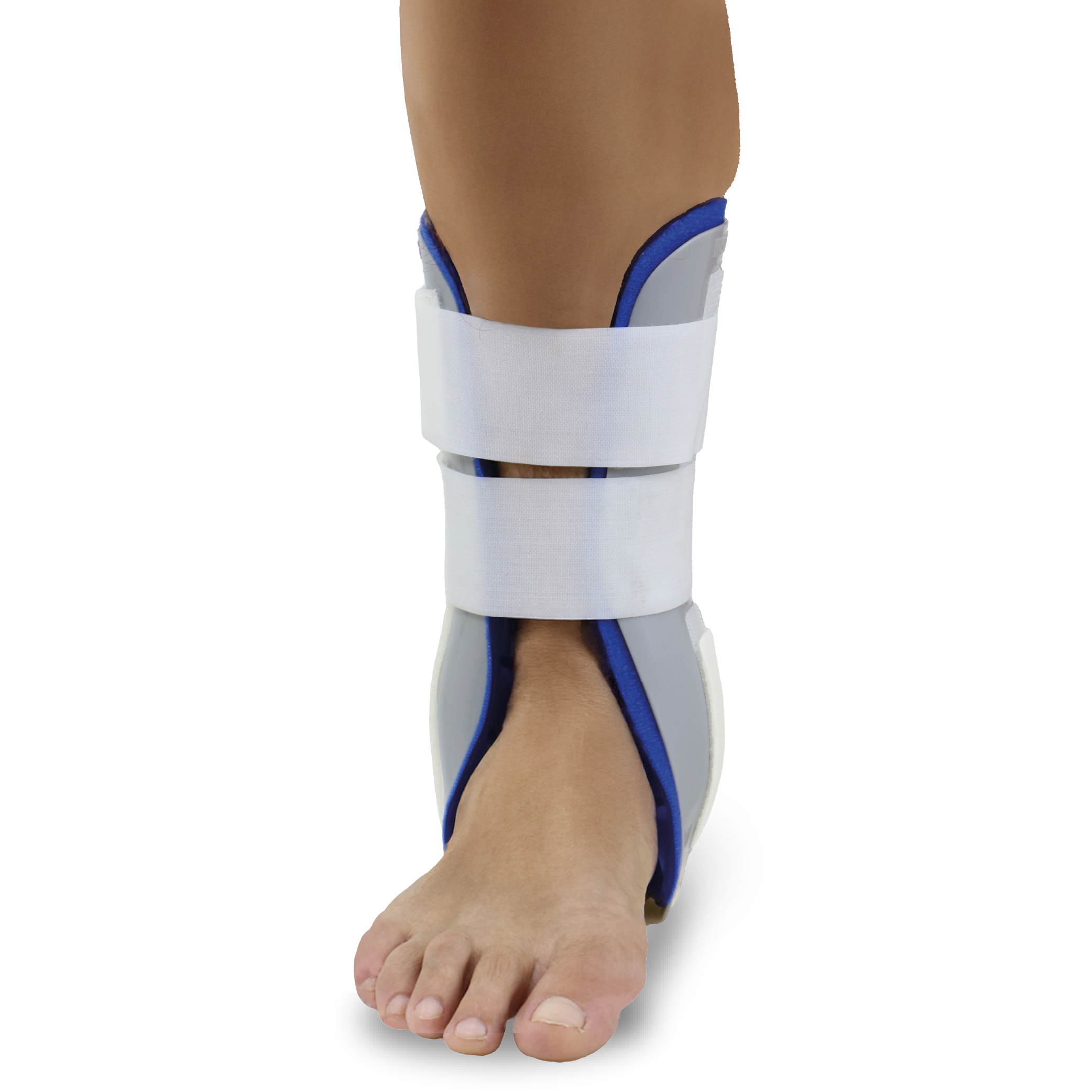 Afrouxe as duas tiras e coloque o calcanhar na base inferior. Certifique-se de que as talas estejam posicionadas da maneira correta (“inside” para dentro e “outside” para fora). Posicione as almofadas de gel no maléolo (tornozelo). Fixe primeiro a tira inferior e depois aperte a tira superior, ambas com um aperto confortável que não prejudique a circulação.